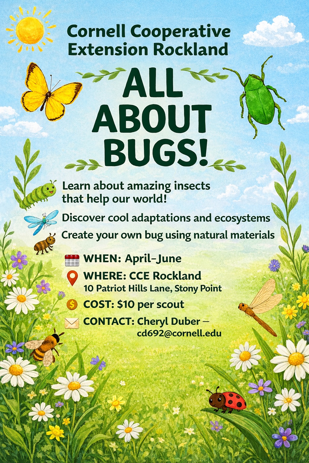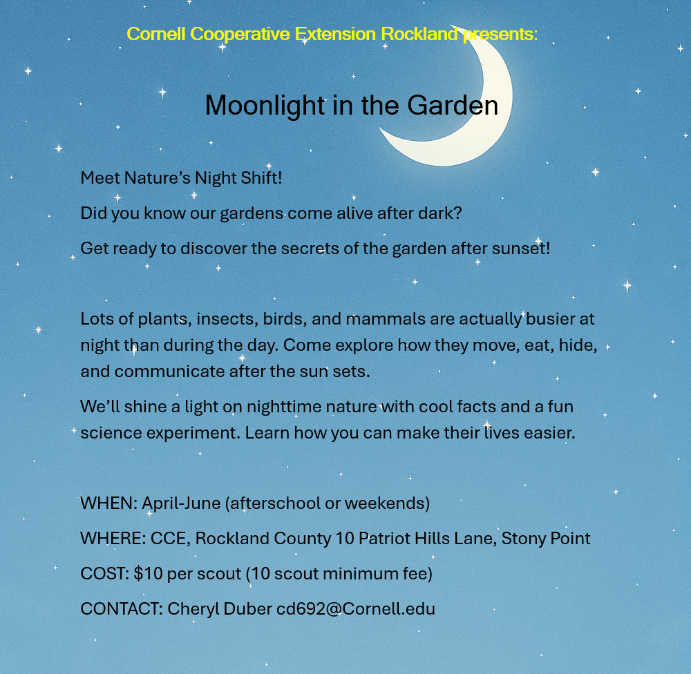 The Master Gardeners of Cornell Cooperative Extension will work with participants to provide nature-based hands-on activities that can enhance your Scouting program. Each program is designed to fulfill Scouting goals with enriching and engaging sessions. Programs are approximately one hour in duration and can be conducted during Scout meetings. Fees are $10.00 per Scout per session with possible additional (at cost) materials fee depending on the program.